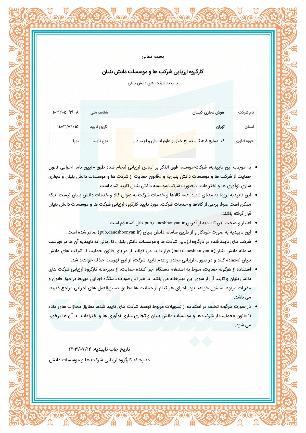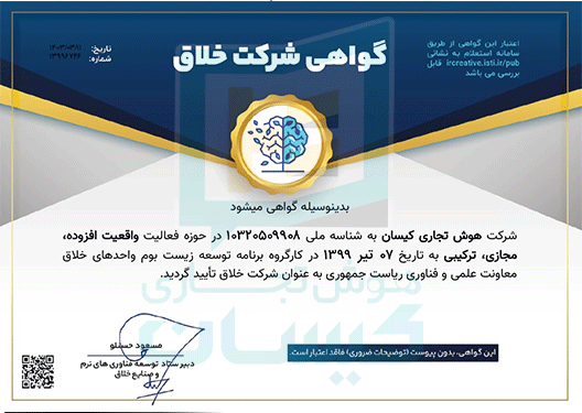 به موجب این تاییدیه، شرکت/موسسه هوش تجاری کیسان بر اساس ارزیابی انجام شده طبق «آیین نامه اجرایی قانون حمایت از شرکت ها و موسسات دانش بنیان» و «قانون حمایت از شرکت ها و موسسات دانش بنیان و تجاری سازی نوآوری ها و اختراعات»، بصورت شرکت/موسسه دانش بنیان تایید شده است.