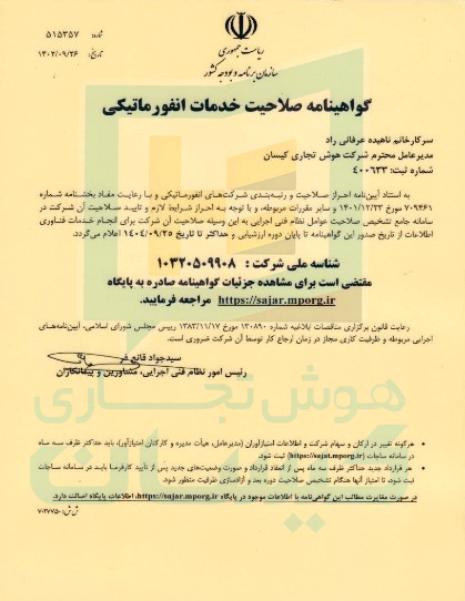 مجوز فعالیت و عضویت نظام صنفی رایانهای کشور به شماره 21012266