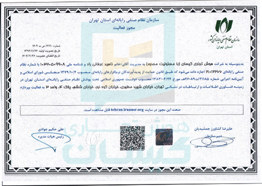 استفاده از فناوری اطلاعات و توسعه محصولات دانشبنیان ما را بر آن داشت تا در کنار سایر مجوزها، اقدام به اخذ مجوز فعالیت و عضویت نظام صنفی رایانهای در حوزه علم داده و هوش تجاری و تولید نرم افزار نماییم.