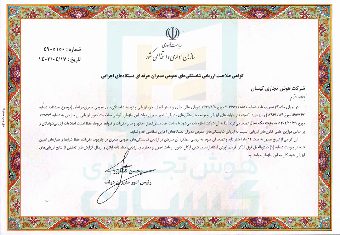 شرکت هوش تجاری کیسان بر اساس تجارب موفق ارائه خدمات در حوزه سرمایه های انسانی و ترکیب خلاقیت و کیفیت با فناوری نوین، در سال 1398 موفق به دریافت مجوز کانون ارزیابی از سازمان اداری استخدامی کشورشد.مجوزها و اعتبارنامهها