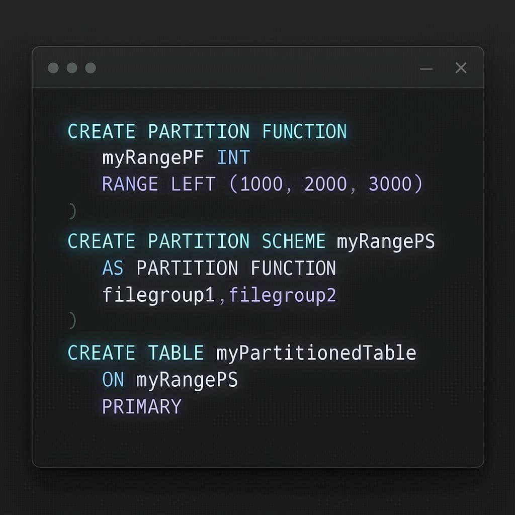 در SQL Server، پارتیشنبندی با استفاده از توابع و جداول پارتیشن انجام میشود. در ادامه نمونهای ساده را میبینیم: