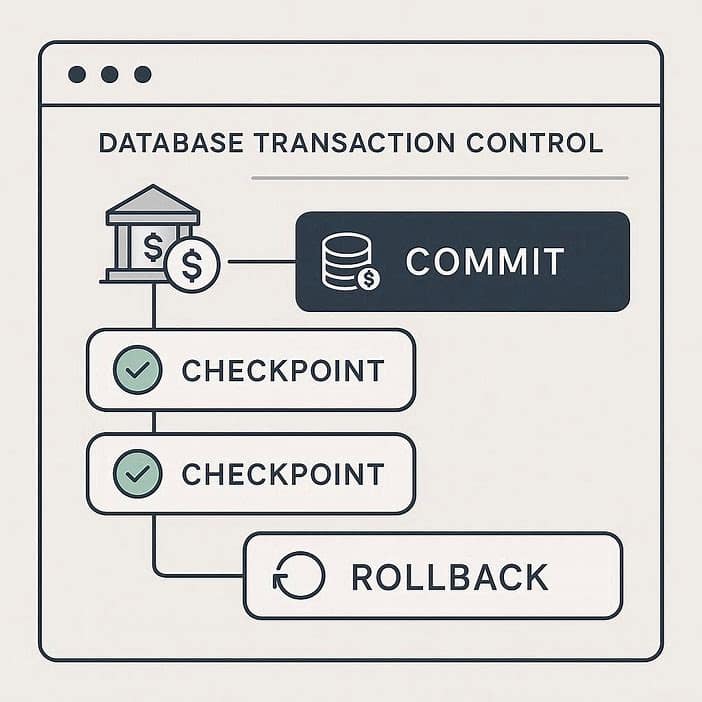 دستورات COMMIT، ROLLBACK و SAVEPOINT برای کنترل تراکنشها استفاده میشوند. این دستورات به شما امکان میدهند تغییرات را ذخیره یا لغو کنید. در سیستمهای حساس مانند سامانههای مالی، این بخش از SQL Cheat Sheet اهمیت بسیار بالایی دارد.