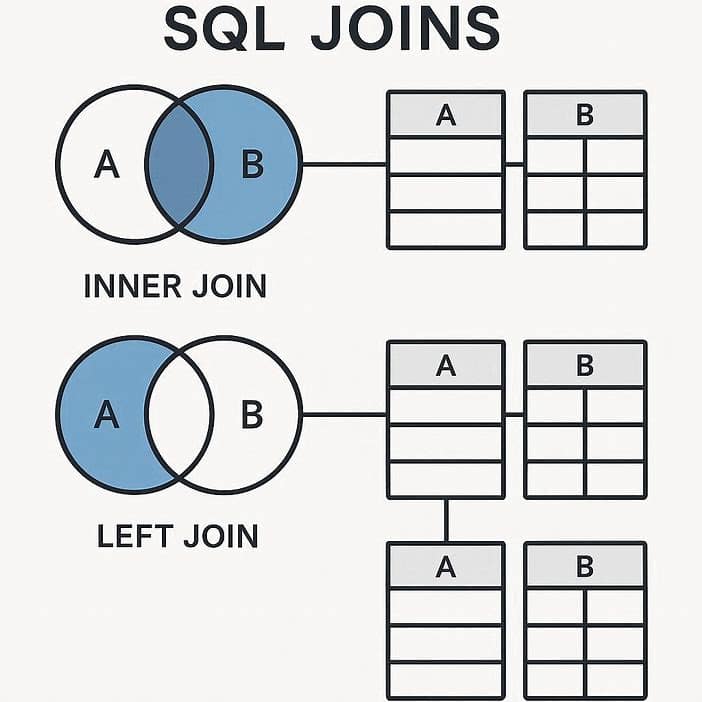 JOINها یکی از حیاتیترین مفاهیم در SQL محسوب میشوند. INNER JOIN، LEFT JOIN، RIGHT JOIN و FULL JOIN به شما امکان میدهند دادهها را از چند جدول مختلف ترکیب کنید. در SQL Cheat Sheet، این بخش به شما کمک میکند تفاوت JOINها را سریع تشخیص دهید و بهترین انتخاب را برای ساخت کوئری داشته باشید.