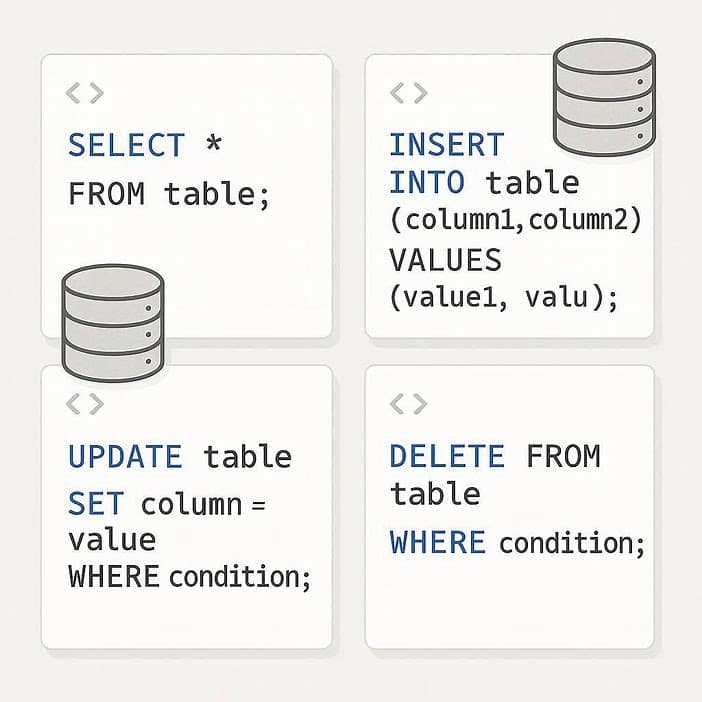 در هر SQL Cheat Sheet، دستورات پایه اهمیت ویژهای دارند. دستور SELECT برای استخراج دادهها، INSERT برای افزودن رکورد جدید، UPDATE جهت ویرایش اطلاعات و DELETE برای حذف دادهها استفاده میشود. این دستورات، ستون اصلی هر خلاصه دستورات SQL هستند و بدون تسلط بر آنها، استفاده حرفهای از پایگاهداده امکانپذیر نخواهد بود.